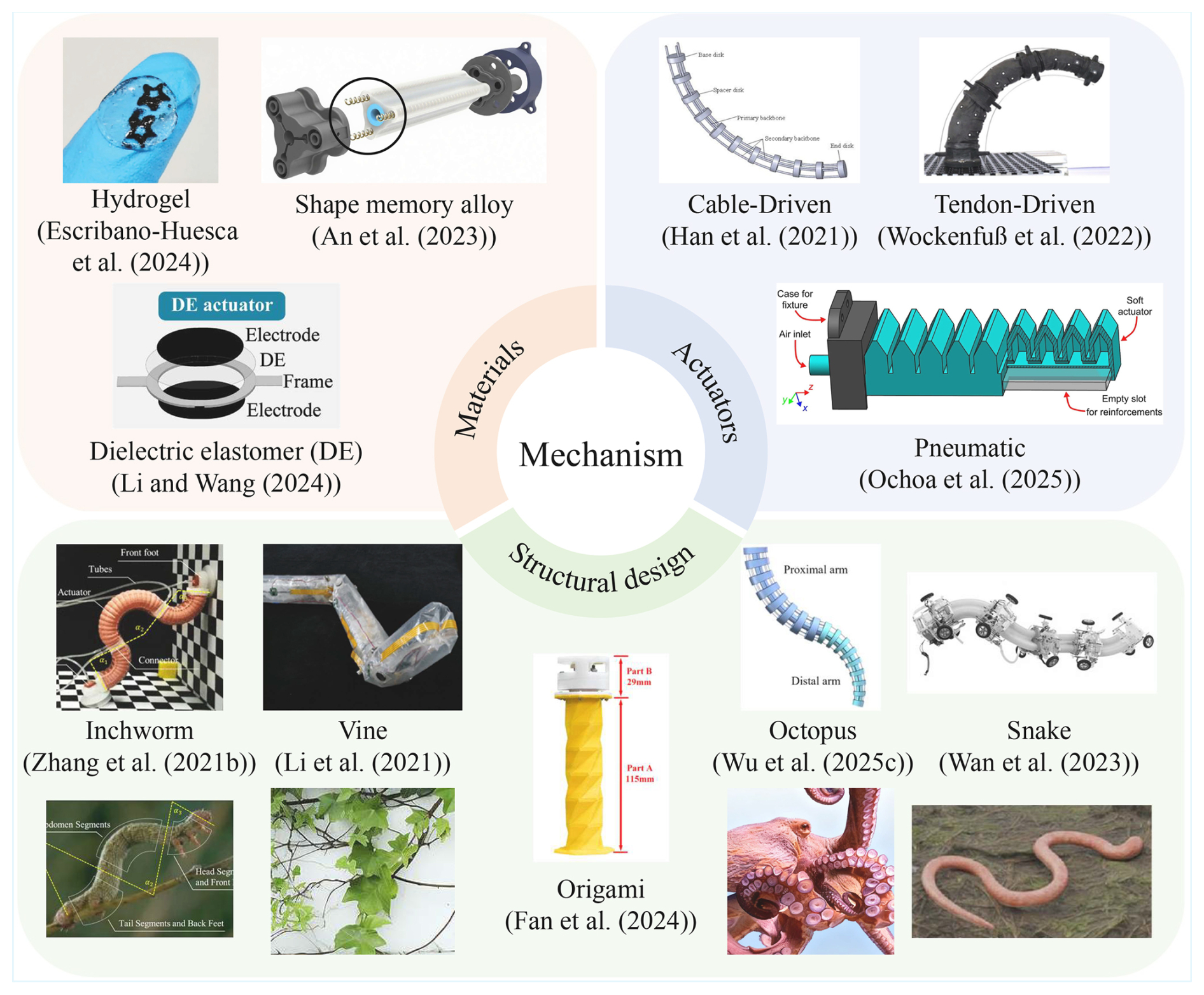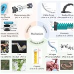 The mechanism of soft robots includes structural design, materials, and actuators, which together determine the motion capability, environmental adaptability, and control strategies of robots. Typical mechanism cases are shown in Fig. 3. The mechanism is not only the basis for modeling, planning, and control but also determines the upper limit of the robot's dynamic performance.