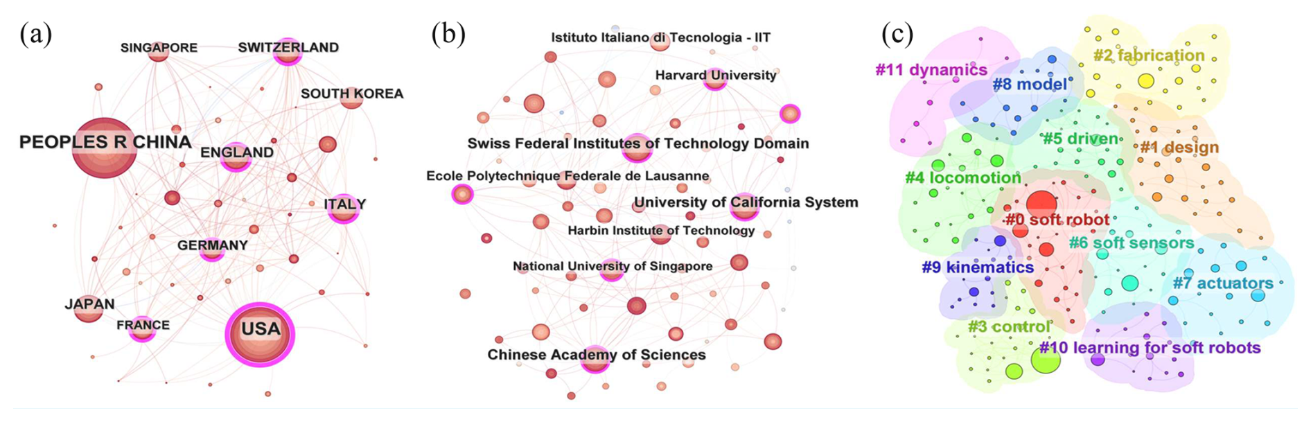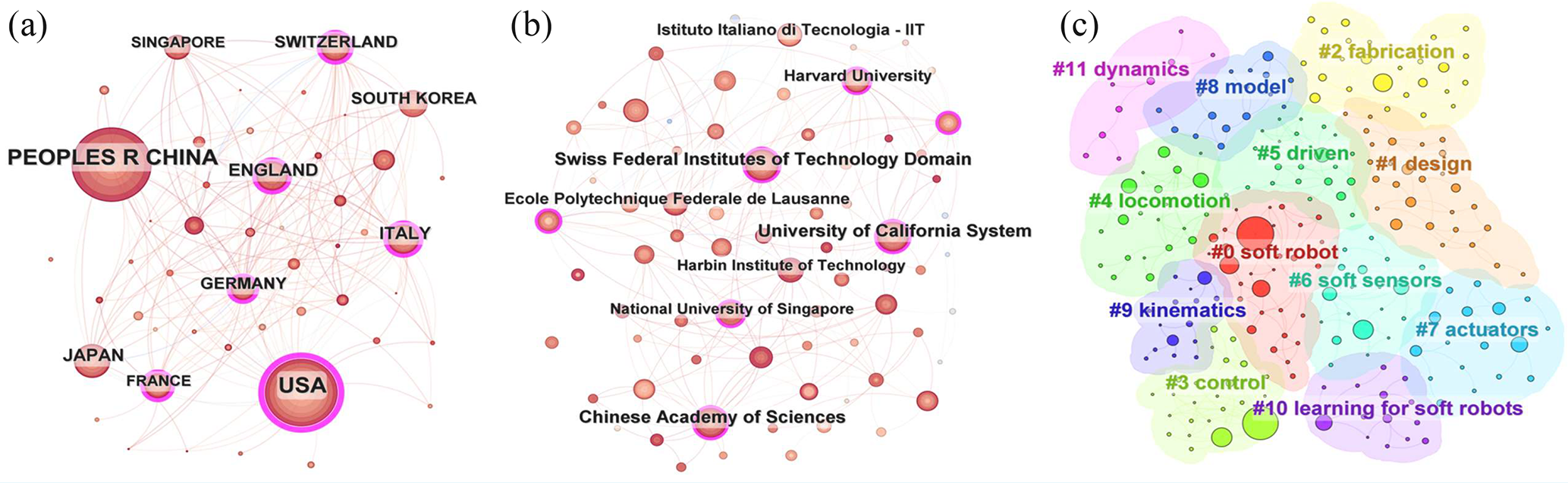Figure 2Network analysis of soft robotics: (a) country analysis, (b) institution analysis, (c) keyword clustering analysis.
