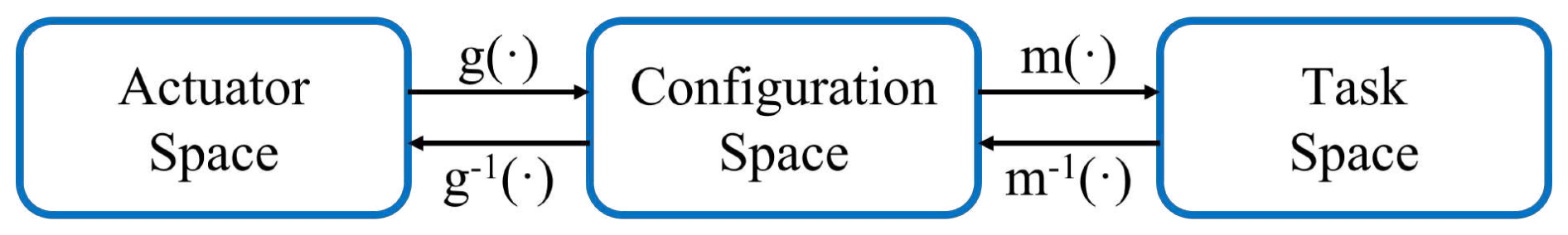 The piecewise constant curvature (PCC) model divides the soft robot into multiple circular segments with constant curvature, to describe its configuration using curvature, arc length, and twist angle. Kinematic modeling divides the robot space into the actuator space, configuration space, and task space, establishing mappings between these spaces through the functions g(⋅) and m(⋅), as shown in Fig. 4. The PCC method is highly efficient in computation, physically interpretable, and adaptable to multi-segment structures, making it widely adopted. For example, Wei et al. (2024) used the PCC method to solve the kinematic mapping relationship. Xu et al. (2023) used this method to establish forward and inverse kinematic models for particle-interference soft robots. He et al. (2023) further introduced Lagrange equations to model soft components, while also considering elastic deformation caused by gravitational loads. Emet et al. (2024) proposed a new procedure that relies on the PCC method to simplify highly complex hyper-redundant soft robotic arm models.