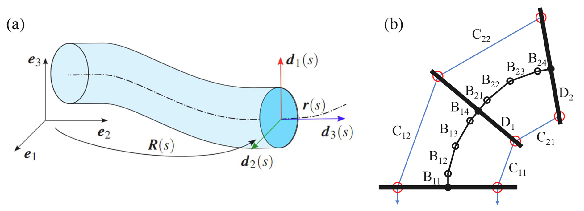 Figure 5Geometric descriptions of the Cosserat rod theory and the pseudo-rigid body model: (a) Cosserat rod theory (Kugelstadt and Schömer, 2016), (b) pseudo-rigid body model (Troeung et al., 2023).