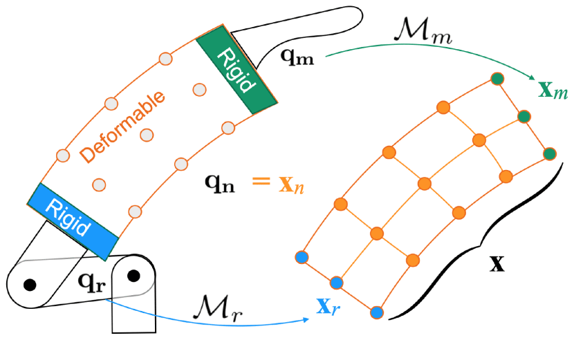 The basic idea of the finite element method (FEM) is to discretize a continuum into a finite number of elements connected by nodes, approximate continuous field variables (including displacement, strain, and stress) using piecewise interpolation functions, and ultimately solve a system of algebraic equations to achieve high-precision simulation of soft robotics' nonlinear large deformations and dynamic behavior. The mapping from coordinate space to finite element space is shown in Fig. 6. Here, qr is the simplified coordinate of the rigid robot, qm is the maximum coordinate of the rigid probe, qn is the node coordinate of the non-rigid body, and M is the mapping function.