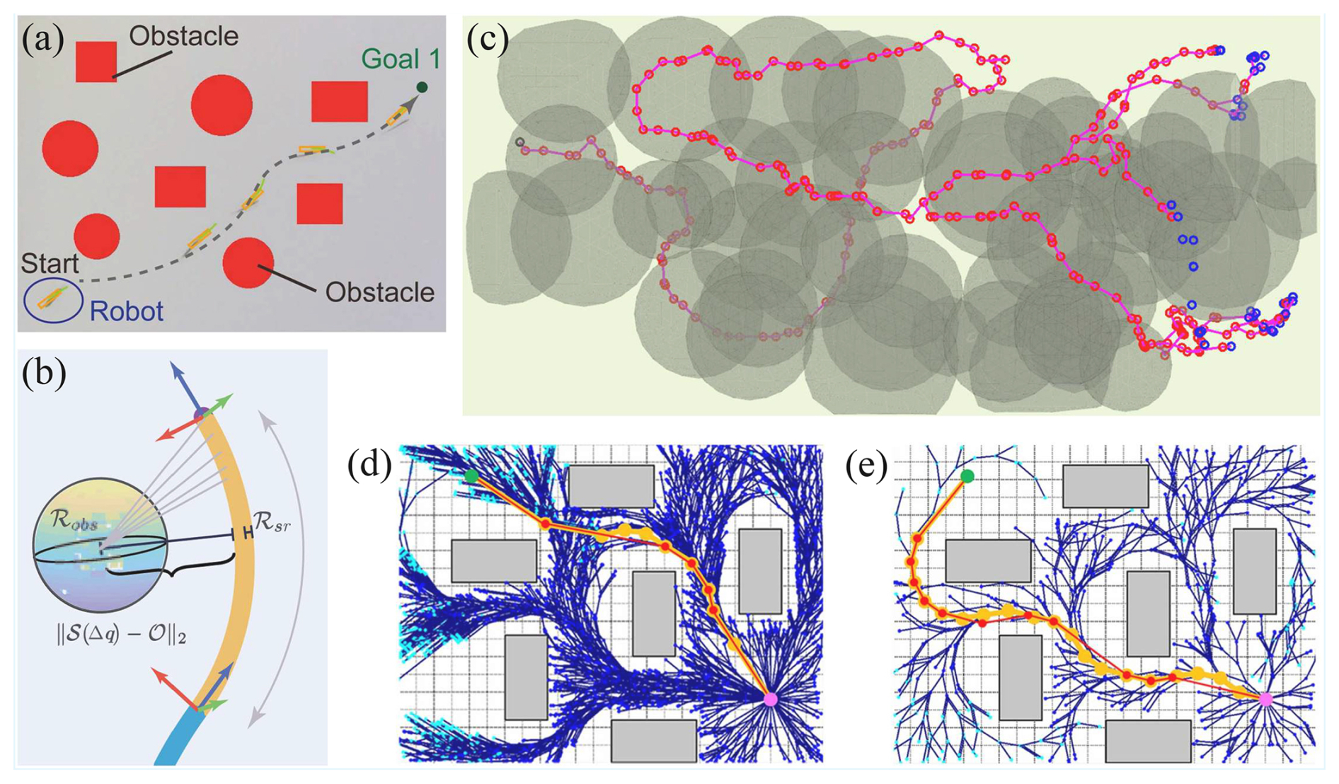 Figure 7Implementation results of the trajectory planning algorithm: (a) automatic navigation in static and obstacle-laden virtual environments (Tian et al., 2025), (b) principle of collision avoidance (Lai et al., 2022), (c) trajectory planning in crowded environments (Gough et al., 2021), (d) RRT∗-based trajectory planning, (e) RRT-based trajectory planning (Satake and Ishii, 2023).