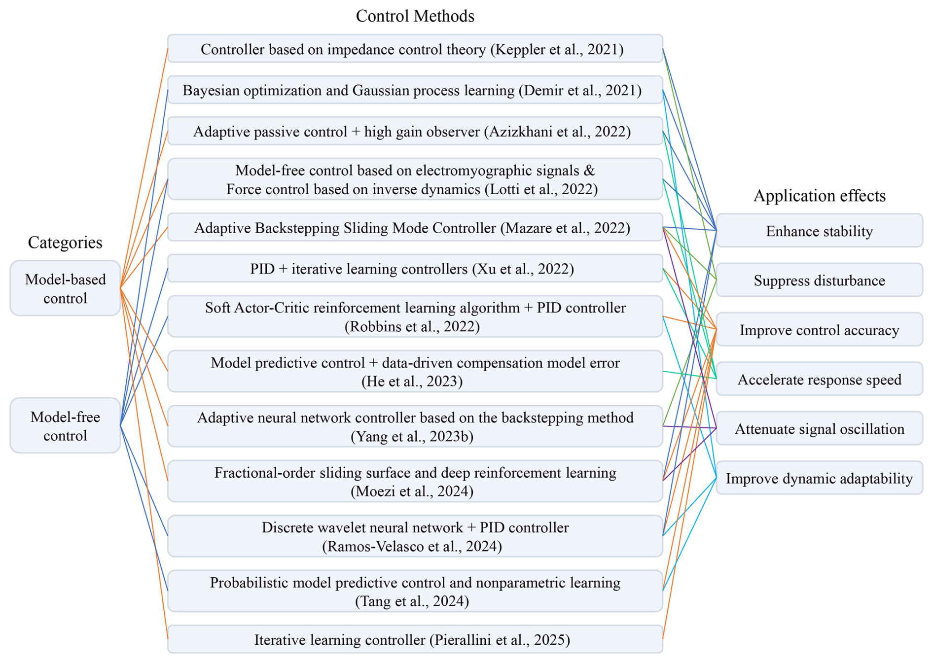 Building upon the previously discussed mechanism, modeling, and planning of soft robots, control should unify and coordinate all elements to enable the robot to execute its intended motions with precision and robustness in real-world environments while compensating for uncertainties and disturbances. Soft robots, characterized by compliant materials, extremely high degrees of freedom, and strong nonlinearities, are difficult to model. Although researchers have achieved the kinematic and dynamic modeling of soft robots using various methods to facilitate the design of model-based controllers, factors such as simplifying assumptions, model simplifications, parametric uncertainties, and external disturbances lead to unmodeled dynamics within the system, posing challenges for control system design. Consequently, control methods that do not rely on models are increasingly being introduced for soft robot control. Some relevant research on both model-based and model-free control are summarized in Fig. 8. It lists specific soft robot control methods from the past 5 years, arranged chronologically. This reveals a growing trend of embedding data-driven approaches into traditional feedback frameworks to form hybrid controllers. Model-based control and model-free control coexist, each with its own advantages and limitations. In terms of application outcomes, enhancing stability and improving tracking accuracy are the two most common performance objectives, reflecting the key challenges in soft robot control.