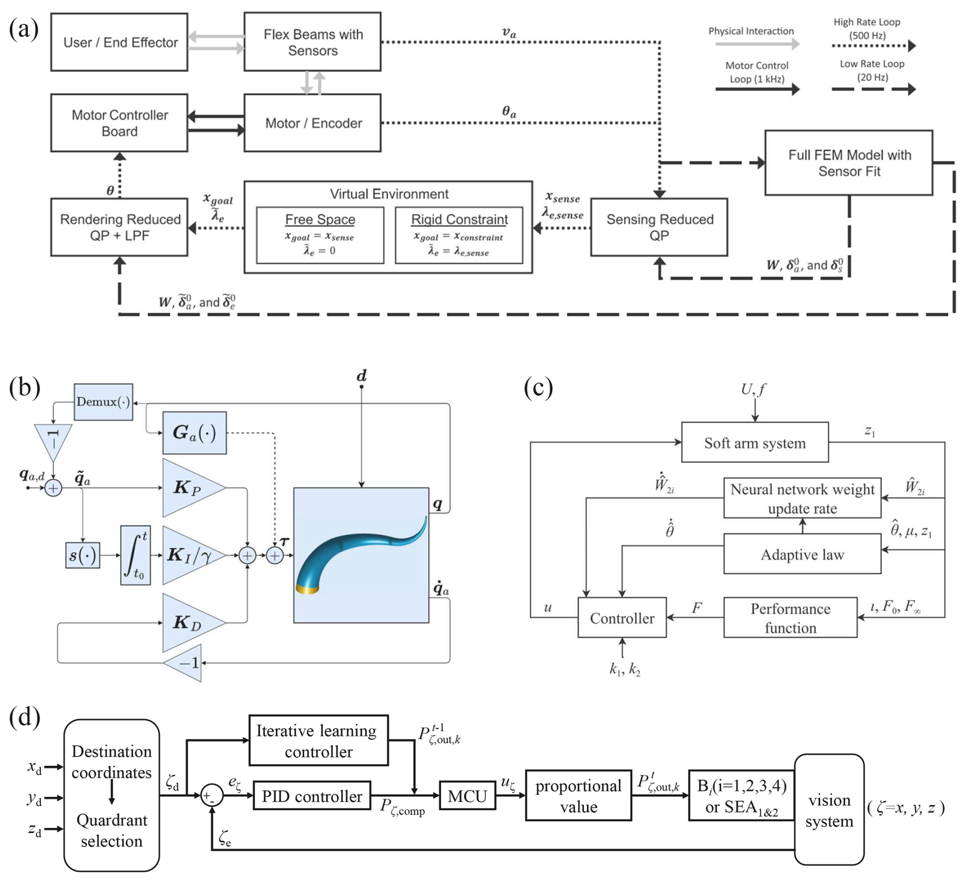 Figure 9System block diagrams of relevant research on soft robot control: (a) multi-rate hierarchical controller (Koehler et al., 2023), (b) PID controller with a saturated integral action (Pustina et al., 2022a), (c) adaptive neural network controller (Yang et al., 2023b), (d) PID and iterative learning controller (Xu et al., 2022).