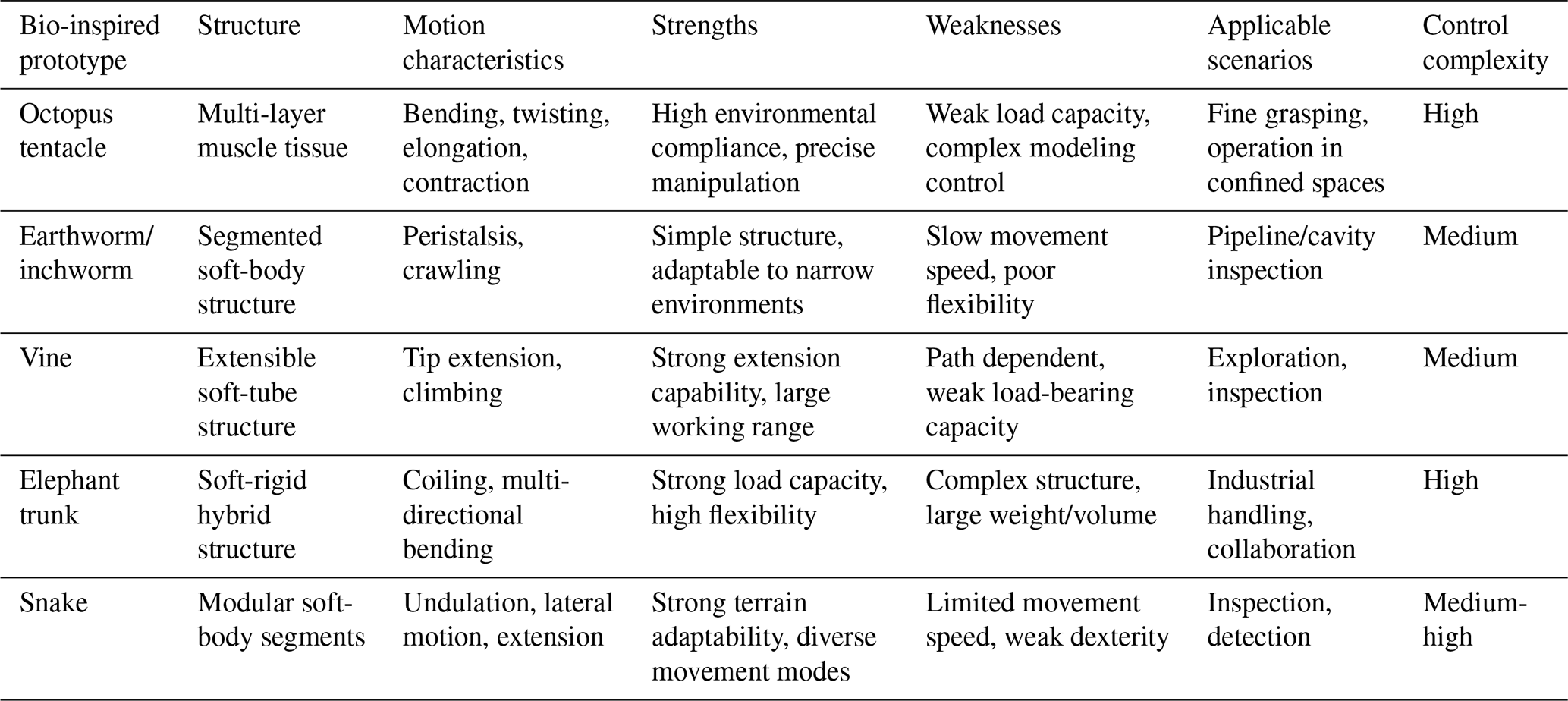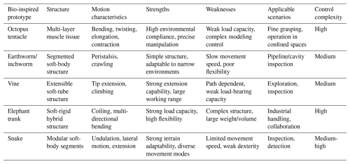 The structural design of soft robots draws heavily on the morphology and movement mechanisms of biological organisms to achieve efficient, flexible, and environmentally adaptive movement. Typical biomimetic-inspired structures include octopus tentacles, earthworms/inchworms, vines, elephant trunks, and snakes. Table 1 provides a comparative analysis of the motion characteristics, strengths, weaknesses, applicable scenarios, and control complexity of various soft robots with bio-inspired structures. Additionally, there are soft robots inspired by origami.