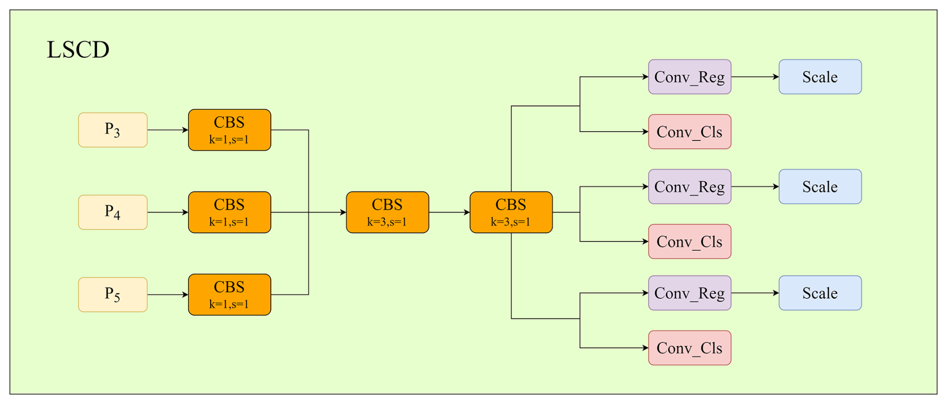 To address this issue, we propose a lightweight shared convolutional detection head (LSCD), which shares convolutional layers across different feature scales to reduce parameters and computational cost (Wang et al., 2024c). As illustrated in Fig. 2, feature maps from P3, P4, and P5 are first aligned by a 1×1 convolution, followed by two shared 3×3 convolutional layers for joint feature extraction. The shared features are then fed into separate classification and regression branches, where a scale layer preserves scale-specific adaptability.