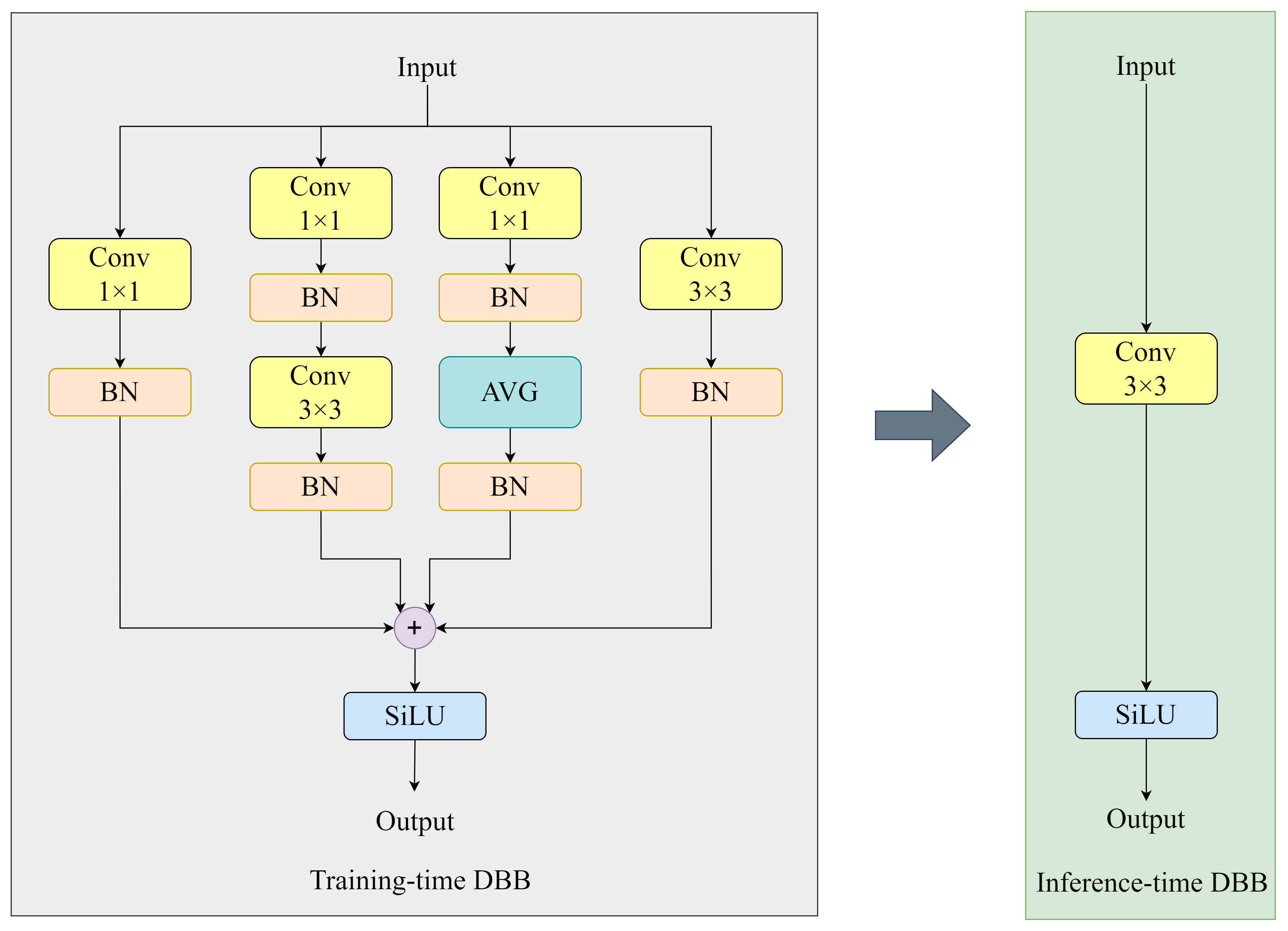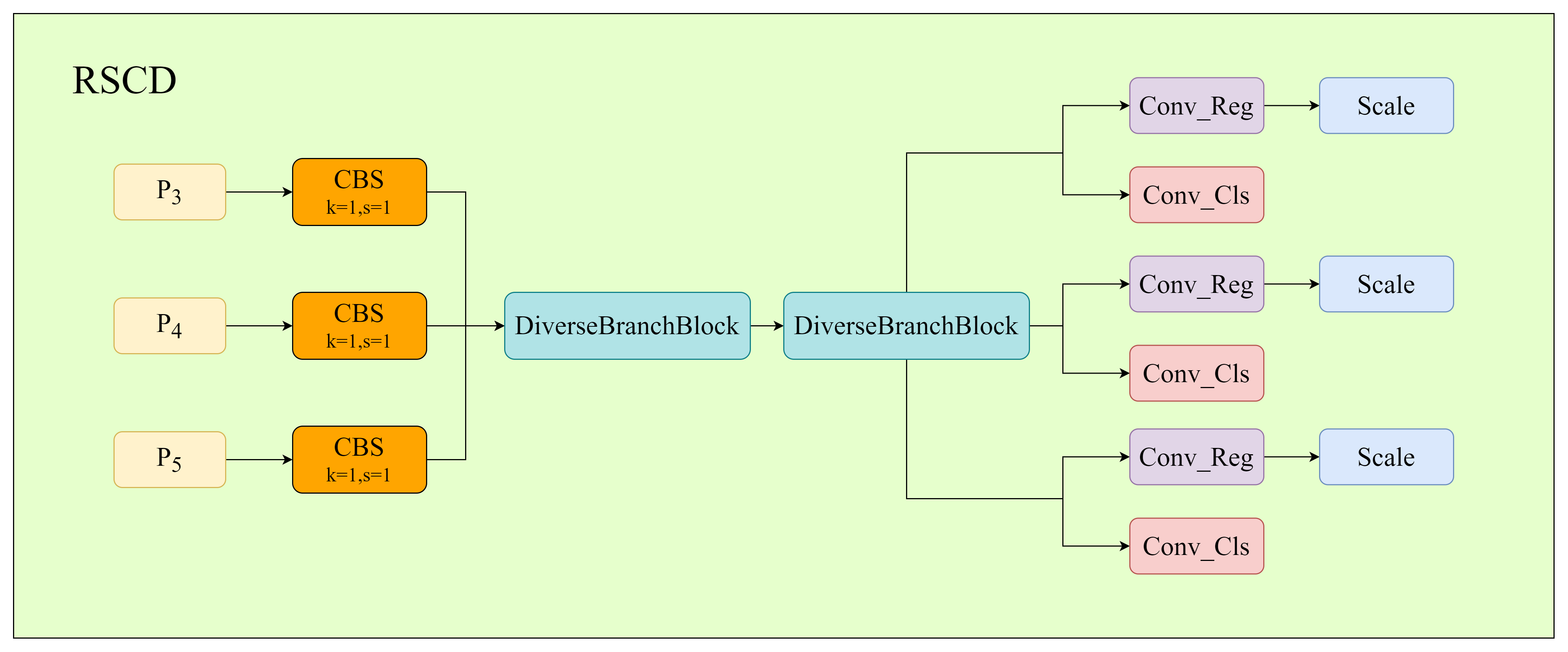 To further enhance representation capability without increasing inference overhead, a diverse branch block (DBB) is incorporated into the shared convolutional layers. DBB introduces multi-branch structures during training to enrich feature representation and is re-parameterized into a single convolution during inference (Ding et al., 2021). The resulting re-parameterized shared convolutional detection head (RSCD) achieves improved detection performance while maintaining high inference efficiency, as shown in Figs. 3 and 4.