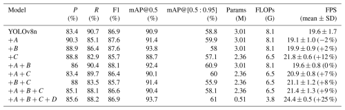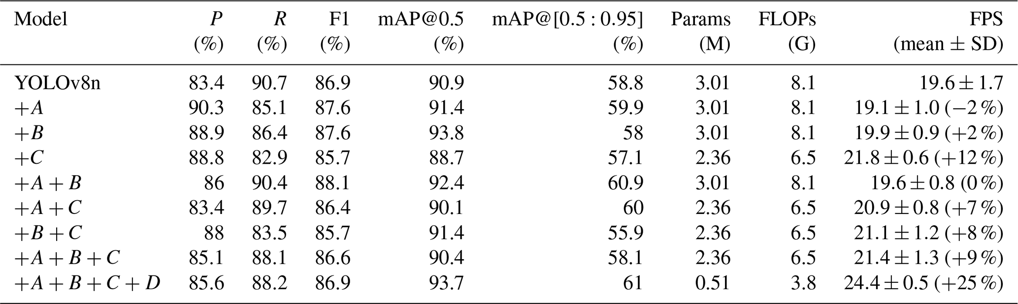 To systematically analyze the contribution of each improvement, all optimization modules were incrementally integrated into the experiments. The experimental results are presented in Table 2, which provides a detailed comparison of the performance gains contributed by each module. Here, A, B, C, and D denote motion blur augmentation, inner-CIoU loss, the RSCD head, and LAMP pruning(ratio=1.5), respectively.