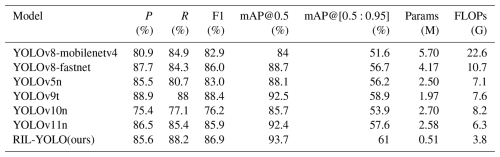 To comprehensively evaluate the performance of the RIL-YOLO model, multiple evaluation metrics were adopted. These include precision (P), recall (R), F1 score, mAP, Params, FLOPs (floating point operations per second), and FPS. Precision, recall, and F1 score evaluate classification performance, while mAP measures overall detection accuracy by computing the area under the precision–recall curve. Params represent the total number of learnable parameters in the model, reflecting model size and memory requirements. FLOPs indicate the computational complexity required for a single forward pass. FPS evaluates inference efficiency and real-time performance. Their calculation formulas are given as follows:
