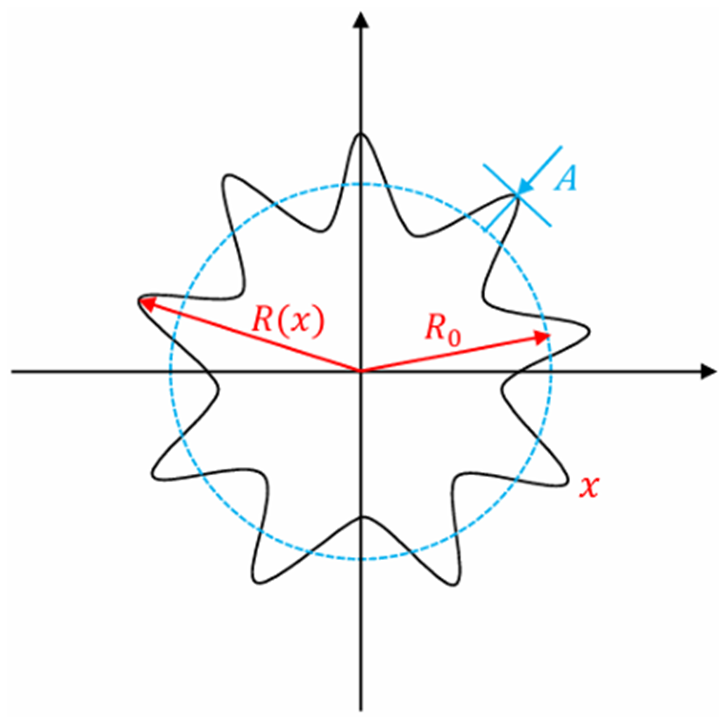 In Eq. (1), x represents the circumference of the wheel, R(x) represents the actual radius of the wheel, and R0 represents the nominal radius of the rolling circle. The following is in polar coordinate form: