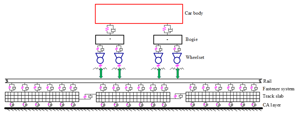 To study wheel–rail vibration and the vertical force caused by wheel polygons, the out-of-roundness and radial deviation of the wheel tread are transformed into inhomogeneous wheel–rail contact surface displacement, then input into the vehicle–rail coupled rolling contact model. The vehicle–rail coupled rolling contact model is shown in Fig. 2 and can accurately predict the noise that occurs under wheel polygon conditions when combined with the conventional unballasted track.