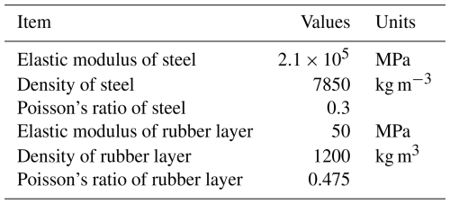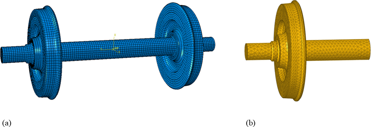 There is a rubber layer in resilient wheels, but standard wheels have no rubber layer. Figure 3 shows the resilient wheelset finite-element model and resilient wheel boundary element model. The finite-element model of the resilient wheelset is shown in Fig. 3a, where the resilient wheelset has a mass of 1310 kg and the standard wheelset has a mass of 1098 kg. The FEM is generated using ABAQUS. The FEM is imported into the multibody dynamics software SIMPACK at a speed of 75 km h−1 to calculate the wheel–rail force in the frequency domain under polygon conditions. The wheel–rail force is then applied to the acoustic model of the wheel shown in Fig. 3b (resilient wheel boundary element model) as a boundary condition. Following this, the SPL of the wheel is calculated in the frequency domain using the acoustic software LMS.VIRTUAL.LAB. The BEM (Liu, 2009; Yang et al., 2025) used to calculate the SPL of the wheel is meshed with tetrahedral cells. The resilient wheel has a mass of 431 kg, and the standard wheel has a mass of 325 kg. The two types of wheels have a diameter of 840 mm. The wheel material parameters used for the simulation in the finite-element and acoustic software are given in Table 1.
