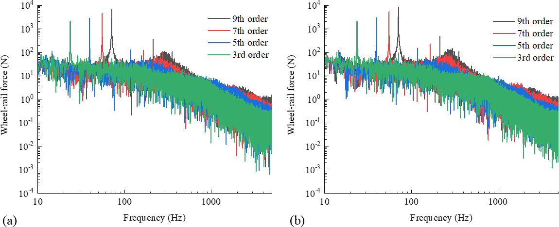 Figure 4Spectrum of wheel–rail force for two types of wheels with different polygon orders (0.07 mm polygon amplitude). (a) Spectrum of wheel–rail force for the standard wheel with different polygon orders. (b) Spectrum of wheel–rail force for the resilient wheel with different polygon orders.