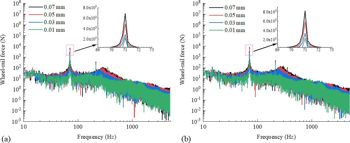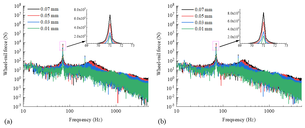 Figure 5Spectrum of wheel–rail force for two types of wheels with different amplitudes of the ninth-order polygon. (a) Spectrum of wheel–rail force for the standard wheel with different amplitudes of the ninth-order polygon. (b) Spectrum of wheel–rail force for the resilient wheel with different amplitudes of the ninth-order polygon.