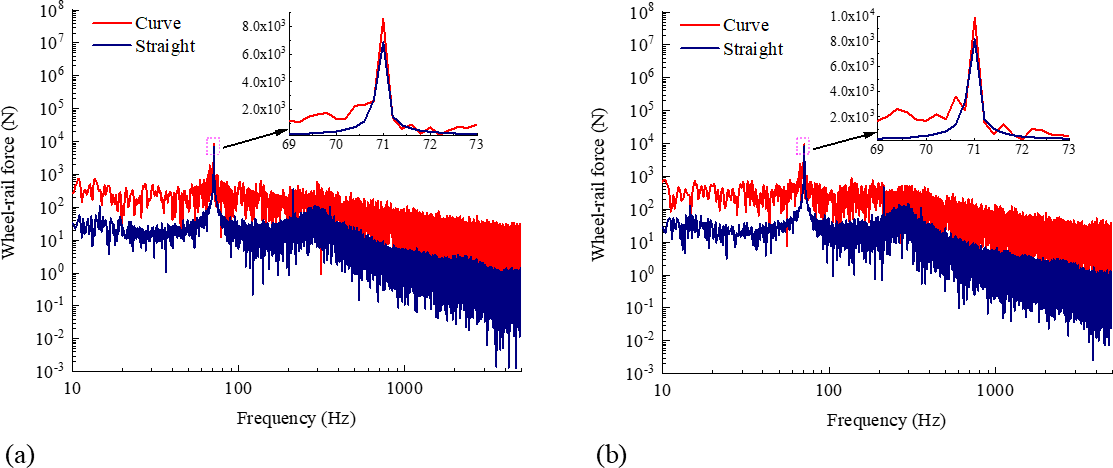 The spectrum of wheel–rail force for the two types of wheels under curved and straight conditions of the ninth-order polygon with 0.07 mm polygon amplitude is shown in Fig. 6. Figure 6a shows the spectrum of wheel–rail force for the standard wheel under curved and straight conditions of the ninth-order polygon with 0.07 mm polygon amplitude, and Fig. 6b shows the spectrum of wheel–rail force for the resilient wheel under curved and straight conditions of the ninth-order polygon with 0.07 mm polygon amplitude. As can be seen, in most frequency bands, the wheel–rail forces for the two types of wheels under curved conditions are 1 to 1.5 orders of magnitude larger than under straight conditions. The peak frequency for the two types of wheels is 71 Hz. The peak vertical wheel–rail force for the standard wheel under curved conditions is 8.56 kN, and under straight conditions it is 6.86 kN. The straight-condition wheel–rail force is about 80.14 % of that under curved conditions. The peak value of the resilient wheel's vertical wheel–rail force is 9.88 kN under curved conditions, while the peak value of the vertical wheel–rail force is 8.17 kN under straight conditions. Under straight conditions, the wheel–rail force is about 82.69 % of that under curved conditions. The peak wheel–rail force of the resilient wheel is larger than that of the standard wheel under curved and straight conditions due to the resilient wheel's greater mass and stronger interaction with the rail, resulting in larger vertical wheel–rail force.
