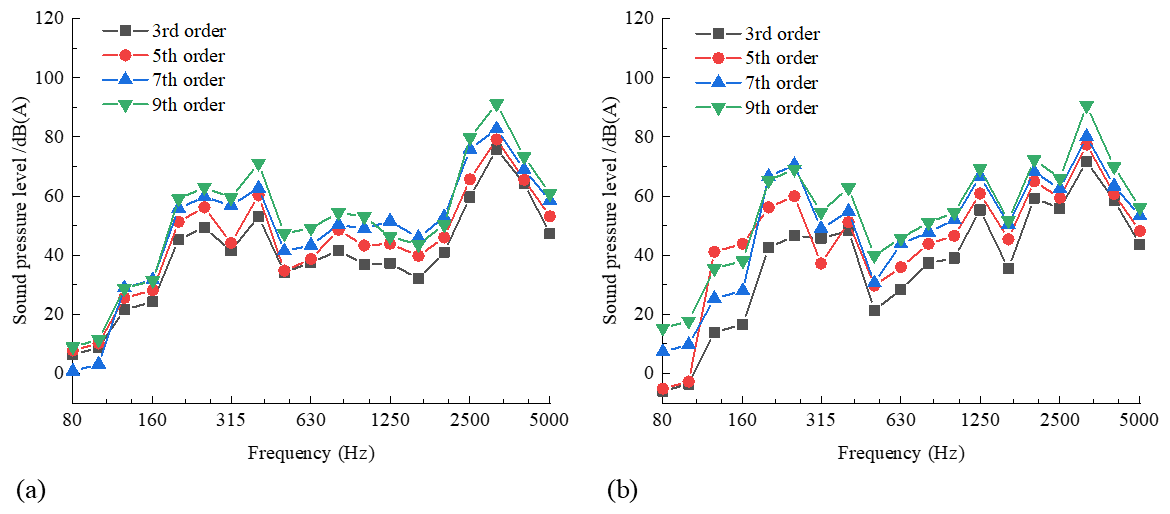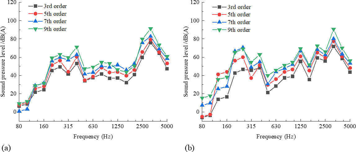 The wheel–rail force results in the frequency domain (0.07 mm polygon amplitude) for the two types of wheels with different polygon orders, as shown in Fig. 4, are introduced into the acoustic BEM (shown in Fig. 3b and c) as a force boundary condition. This allows the -octave spectral sound pressure level (0.07 mm polygon amplitude) for the two types of wheels with different polygon orders to be obtained, as shown in Fig. 7. The -octave spectral sound pressure levels for the standard and resilient wheels with different polygon orders are shown in Fig. 7a and b, respectively. In the frequency range of 400–5000 Hz, it is clear that the effect of polygon order on the spectral characteristics of the radiated SPL of the two types of wheels is limited in value. The larger the order, the higher the SPL of the two types of wheels; however, the frequency of the peaks does not change significantly, remaining at 3150 Hz. Additionally, the radiated SPL of the resilient wheel is lower than that of the standard wheel in the 2500–5000 Hz frequency range. The reason for this is that the rubber layer absorbs energy, increasing wheel energy dissipation and reducing wheel vibration, thus reducing the high-frequency SPL.