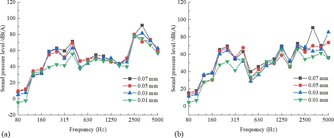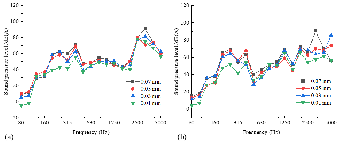 Figure 8 shows the -octave spectral sound pressure level for the two types of wheels with different polygon amplitudes of the ninth-order polygon. Figure 8a shows the -octave spectral sound pressure level for the standard wheel with different polygon amplitudes of the ninth-order polygon, and Fig. 8b shows the -octave spectral sound pressure level for the resilient wheel with different polygon amplitudes of the ninth-order polygon. The standard wheel radiated a low-frequency SPL, with a local peak at 400 Hz frequency, while the resilient wheel showed a peak at 250 Hz. Additionally, there is no significant linear relationship between polygon amplitude and SPL for either wheel in most frequency bands. In the 2500–5000 Hz frequency range, under the same working condition, the SPL radiated by the resilient wheel is generally lower than that of the standard wheel, indicating that the resilient wheel can reduce high-frequency SPL. This is because the rubber layer reduces the wheel's vibration, thus reducing the high-frequency SPL.